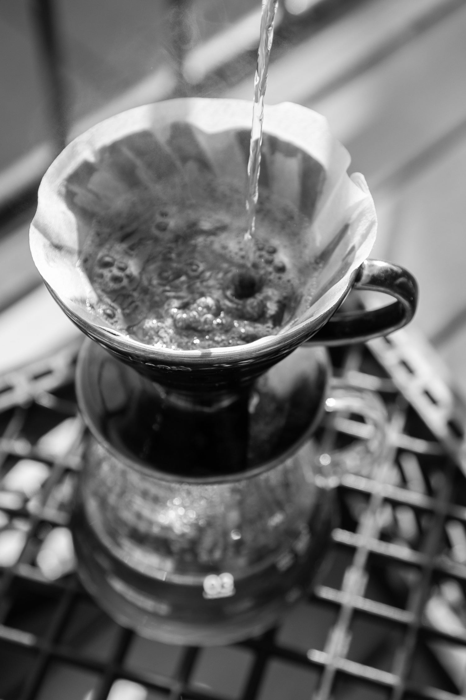 Start with rinsing your coffee filter, this prevents the papery taste from the filter from affecting your coffee while simultaneously warming the vessel that the coffee will drip into. This process should take a matter of seconds until the filter is completely wet. Empty the water from the vessel and tare the scale.